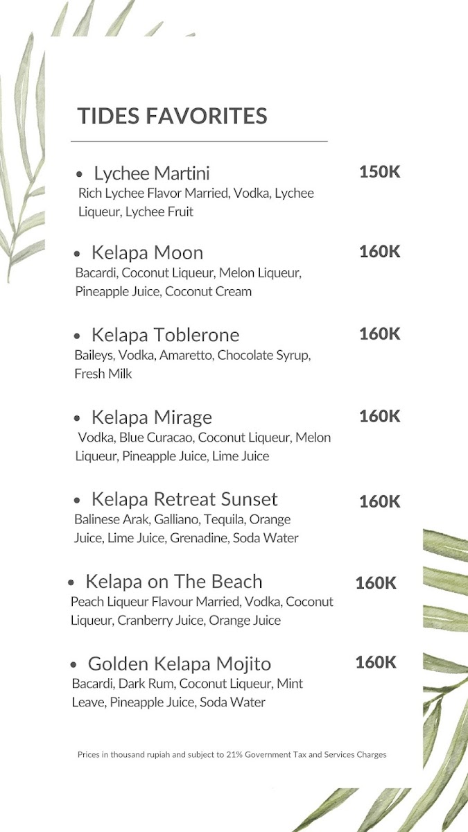 Welcome to Tides Restaurant and Bar, a hidden gem nestled within the picturesque Hotel Kelapa Retreat and Spa in Bali. Overlooking the tranquil sea, this beachfront sanctuary invites you to indulge in a culinary journey that balances traditional Balinese flavors with international cuisine.